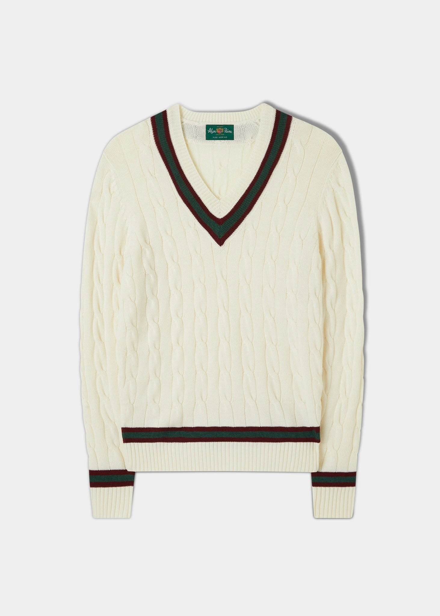 Knitted in fine merino wool, our Ecru vee neck cricket jumper is a contemporary take on the traditional style. Featuring a sophisticated cable design, we’ve added a striking trim around the vee, cuffs and the welt.