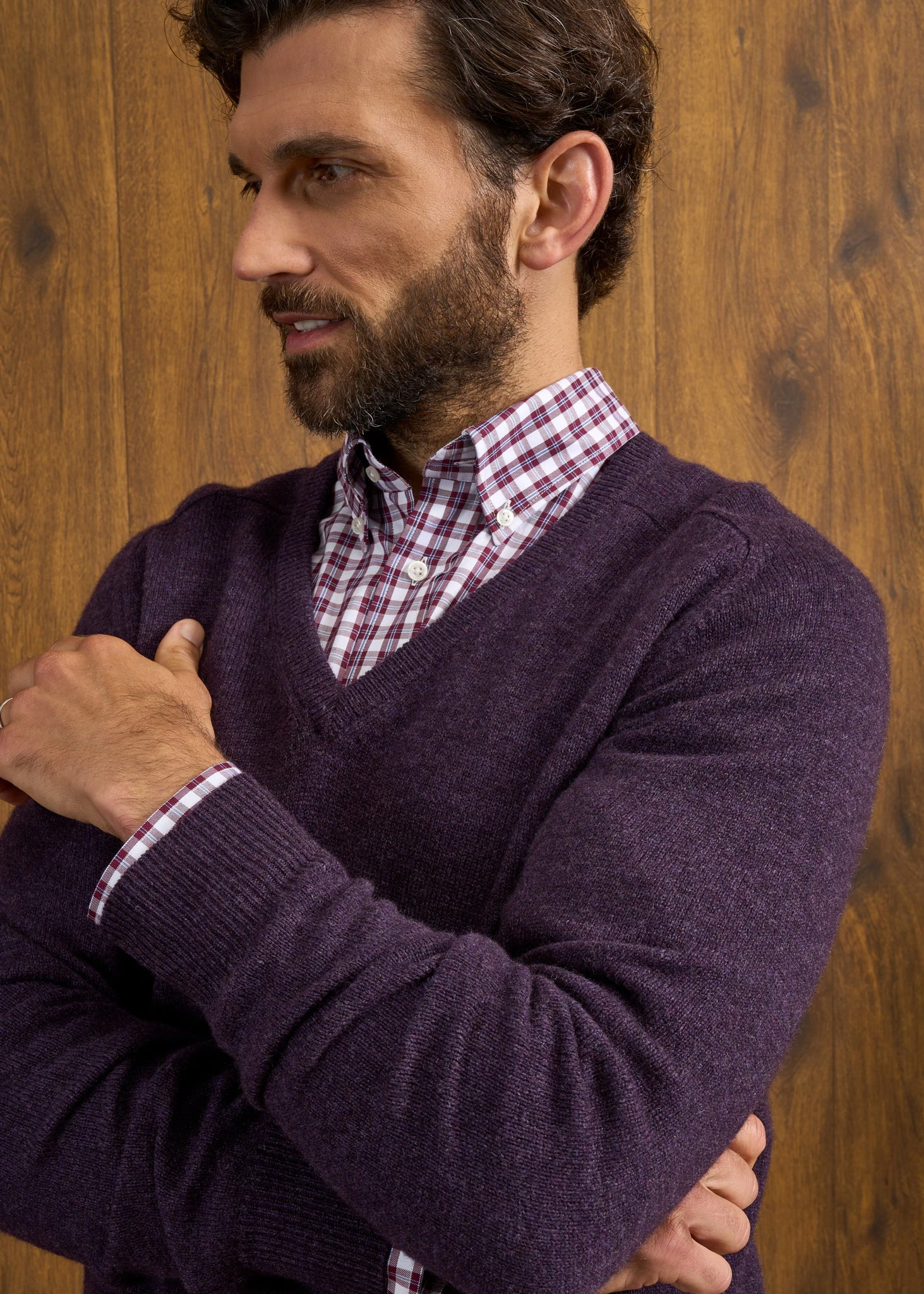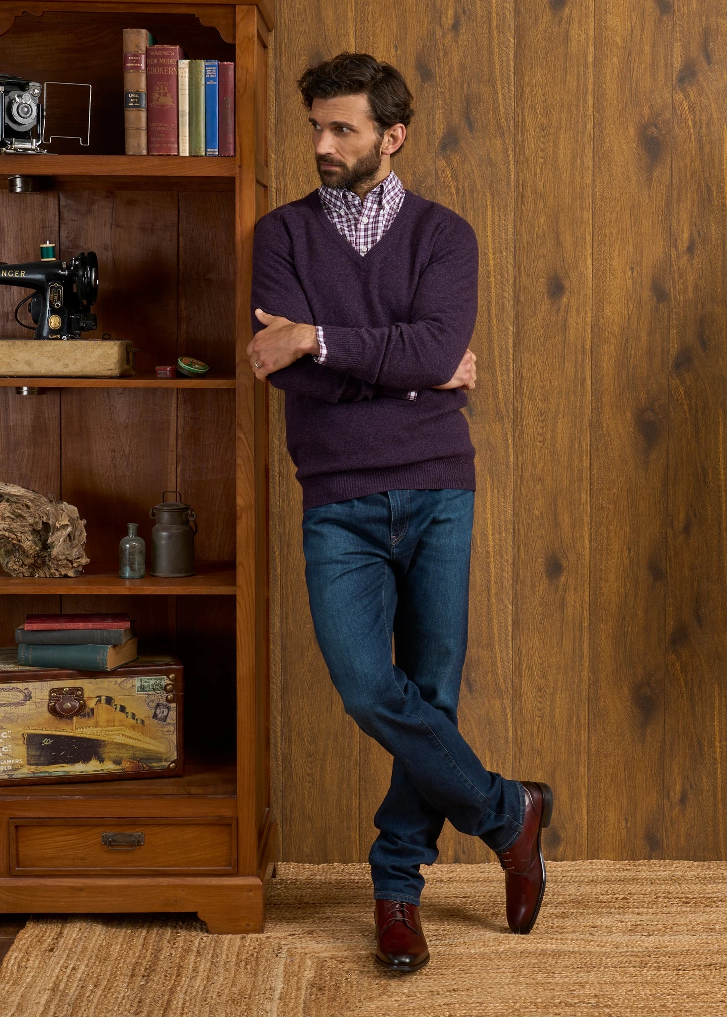 A true classic. This V-neck jumper in Elderberry is crafted from pure super-soft lambswool and spun by Europe’s oldest spinner, Z. Hinchliffe, founded in Yorkshire, England 250 years ago. It has a full saddle shoulder shaping, generously cut across the waist, designed with a relaxed, more-traditional and comfortable fit.