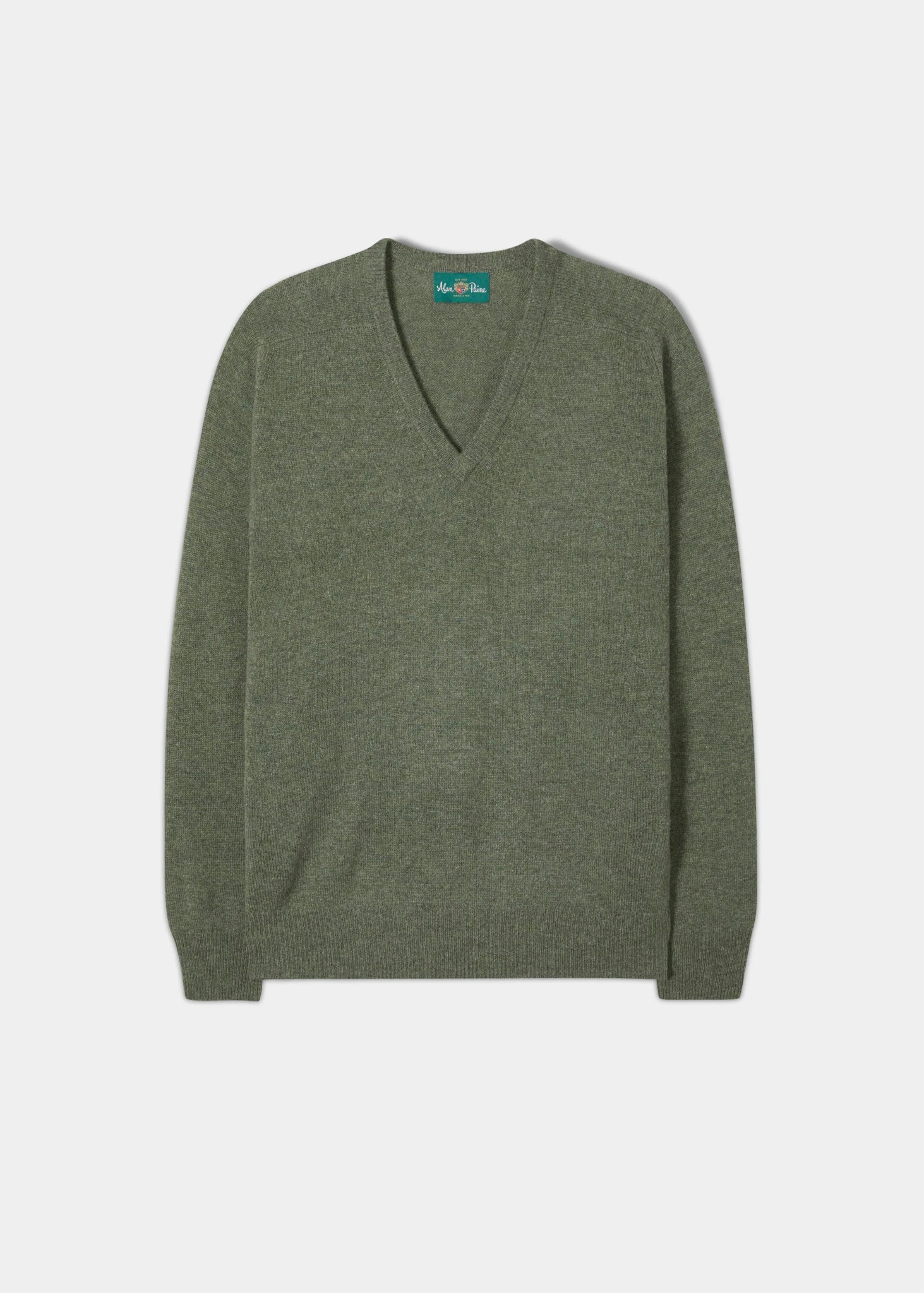 A true classic. This V-neck jumper in L;andscape is crafted from pure super-soft lambswool and spun by Europe’s oldest spinner, Z. Hinchliffe, founded in Yorkshire, England 250 years ago. It has a full saddle shoulder shaping, generously cut across the waist, designed with a relaxed, more-traditional and comfortable fit.