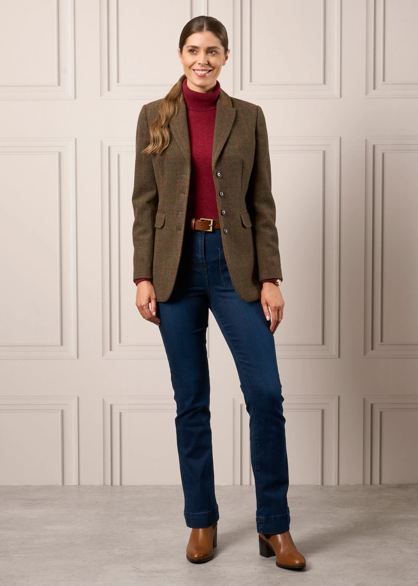 Effortlessly stylish, a tweed blazer is the cornerstone of your wardrobe and a trans-seasonal must-have. Crafted in a specially selected contemporary-coloured medium weight pure wool tweed and with a water repellent outer, dress up or dress down depending on the occasion. Featuring a contrast faux suede top collar and contrast piping detail, this blazer in Hemlock is a perfect addition to our collection.